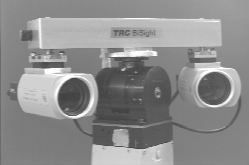 Working together with HelpMate Robotics Inc. (formerly TRC) and the Universities of Rochester, Maryland and Massachusetts, we developed the specifications for the binocular camera platform that became the HelpMate BiSight head in 1994. The goal of this successful SBIR was (and is) the communal benefit to research through the sharing of a common hardware base. We have obtained the 2-axis version (independent pan) of the BiSight head and are using it for vergence and version control of two remote-head CCD cameras and motorized lenses. The SONY cameras (XC77-RR) weigh 65 grams each and have a b/w 2/3" sensor (768x493 pixels) with an electronic aperture. The Fujinon lenses (H10x11E-MPX31) weigh 530 grams and have motorized zoom (11 to 110 mm), focus (1.2 m to infinity) and aperture (F1.9 to F22). Both the 10:1 zoom and the focus have potentiometer feedback. External lenses (1 or 2 diopter) can be added to obtain shorter working distances.