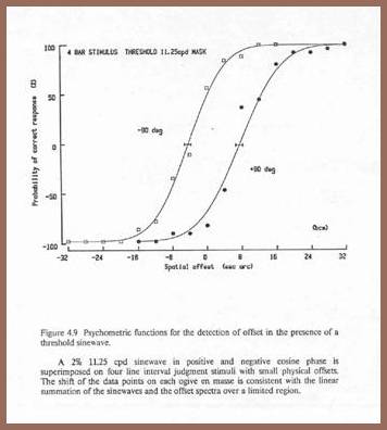 The most satisfying and elegant (imho) result in my thesis was that the superposition of a threshold sinewave with the appropriate (theory-predicted) spatial frequency and phase induced a perceived threshold shift in spatial position (Figure 4.9) while other grating configurations had no effect. In addition, apart from the reconciliation of the major metrics of acuity and accounting for the many stimulus interactions, the thesis data contain a wealth of opportunities that should be developed further.