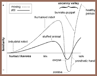 The second of Mori’s conjectures revolved around the relative ratings for moving and static three-dimensional representations. Mori proposed that moving simulacra were endowed with familiarity at a greater rate as their human likeness increased, succumbed to lower ratings in the Uncanny Valley, and achieved greater familiarity maxima as they reached complete human likeness than did non-animated humanoid representations of equivalent human likeness. Empirically, the performance of moving 3D objects were able to reach very high levels of human likeness and were able to generate appreciable amounts of familiarity (as with the bunraku puppets) even though the ratings of both human likeness and the familiarity that the same objects engendered when static were usually appreciably lower.